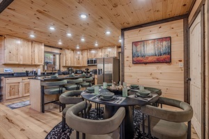 Inside, you’re greeted by an open-concept living room where expansive windows showcase the forest canopy. A modern electric fireplace and stylish furnishings create a cozy yet contemporary vibe, while the fully equipped kitchen and dining area invite effortless gatherings over home-cooked meals or late-night snacks.